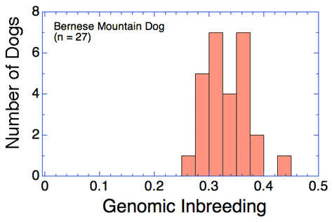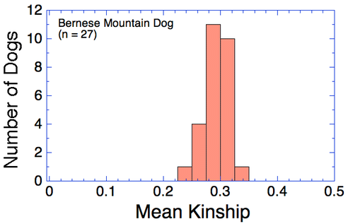 The coefficient of inbreeding of a dog is the kinship coefficient of its parents. Mean kinship is the average of the kinship coefficients between a dog and all other dogs in the population including itself. Dogs that are least related to the rest of the dogs in the breed, and are therefore genetically valuable, will have low mean kinship. A value > 0.25 means that a dog is on average more closely related to the other dogs in the population than full siblings.