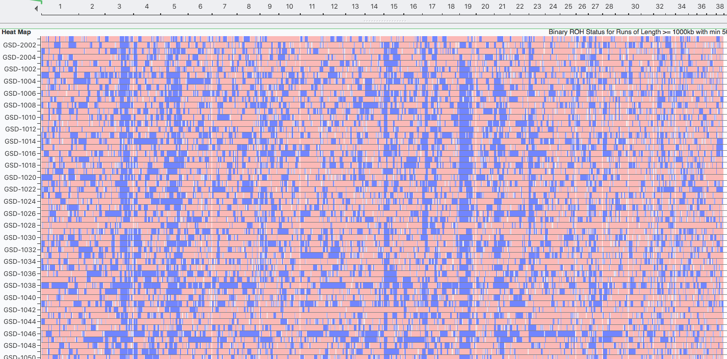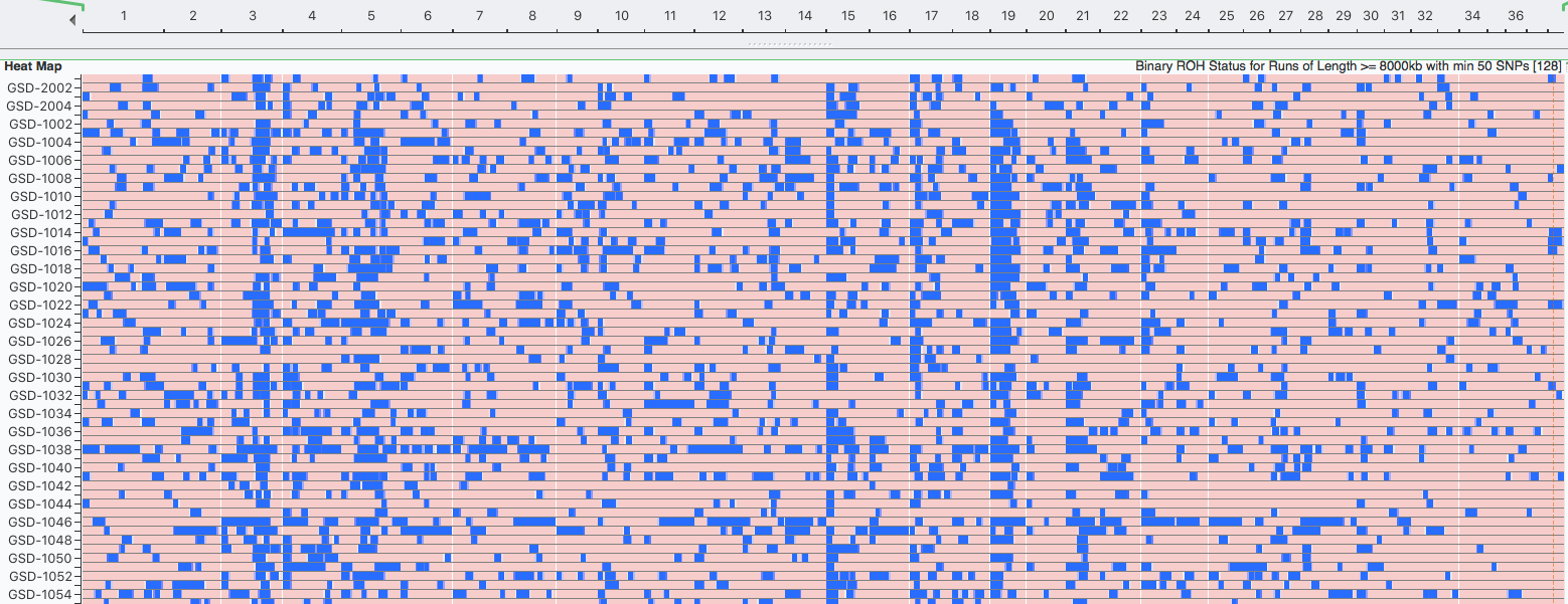 Inbreeding tends to produce runs (blocks) of homozygosity (ROH) on the chromosomes. Over time, the crossing-over of chromosomes during meiosis can split up blocks of homozygosity, so the largest blocks are likely to be the most recent inbreeding and smaller blocks reflect older inbreeding. ROH are used to estimate inbreeding from SNP data.