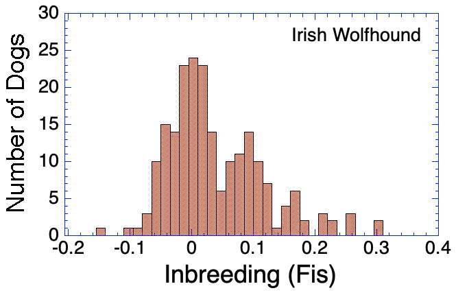 (For reference: Fis = 0 indicates the population is breeding randomly; positive Fis indicate that dogs are more related than you would expect if they were randomly breeding – that is, they are being preferentially inbred; negative Fis indicates that dogs are less related than you would expect in a randomly breeding population.)