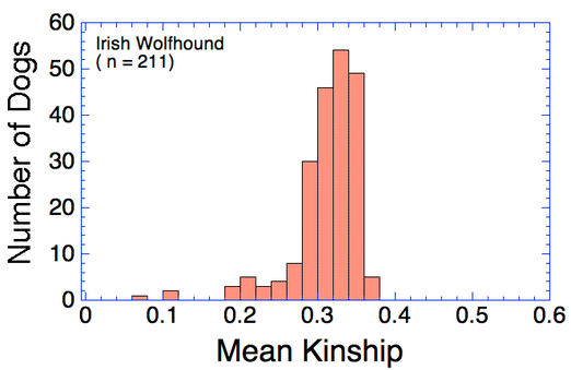 The coefficient of inbreeding of a dog is the kinship coefficient of its parents. Mean kinship is the average of the kinship coefficients between a dog and all other dogs in the population including itself. Dogs that are least related to the rest of the dogs in the breed, and are therefore genetically valuable, will have low mean kinship. A value > 0.25 means that a dog is on average more closely related to the other dogs in the population than full siblings.